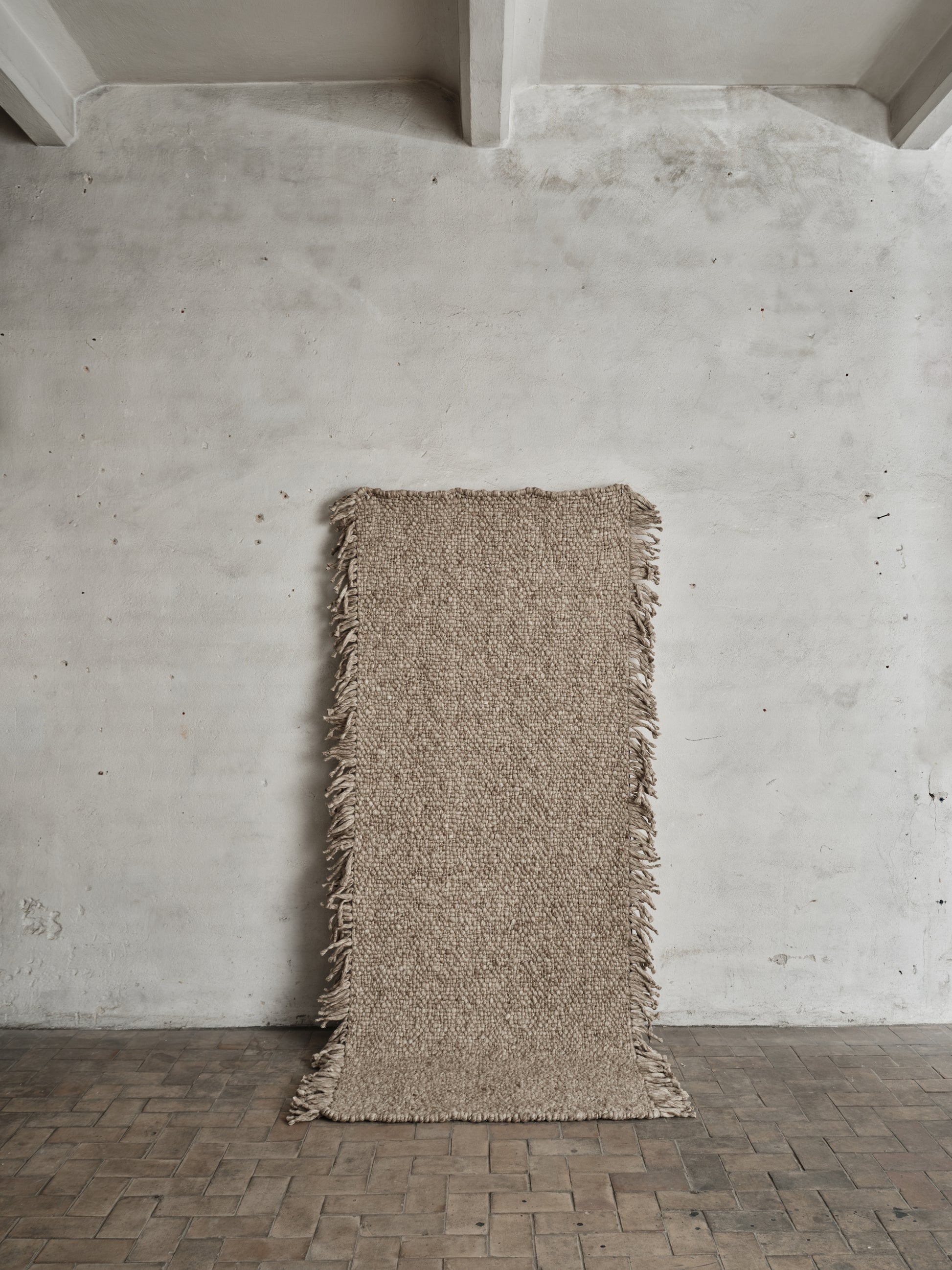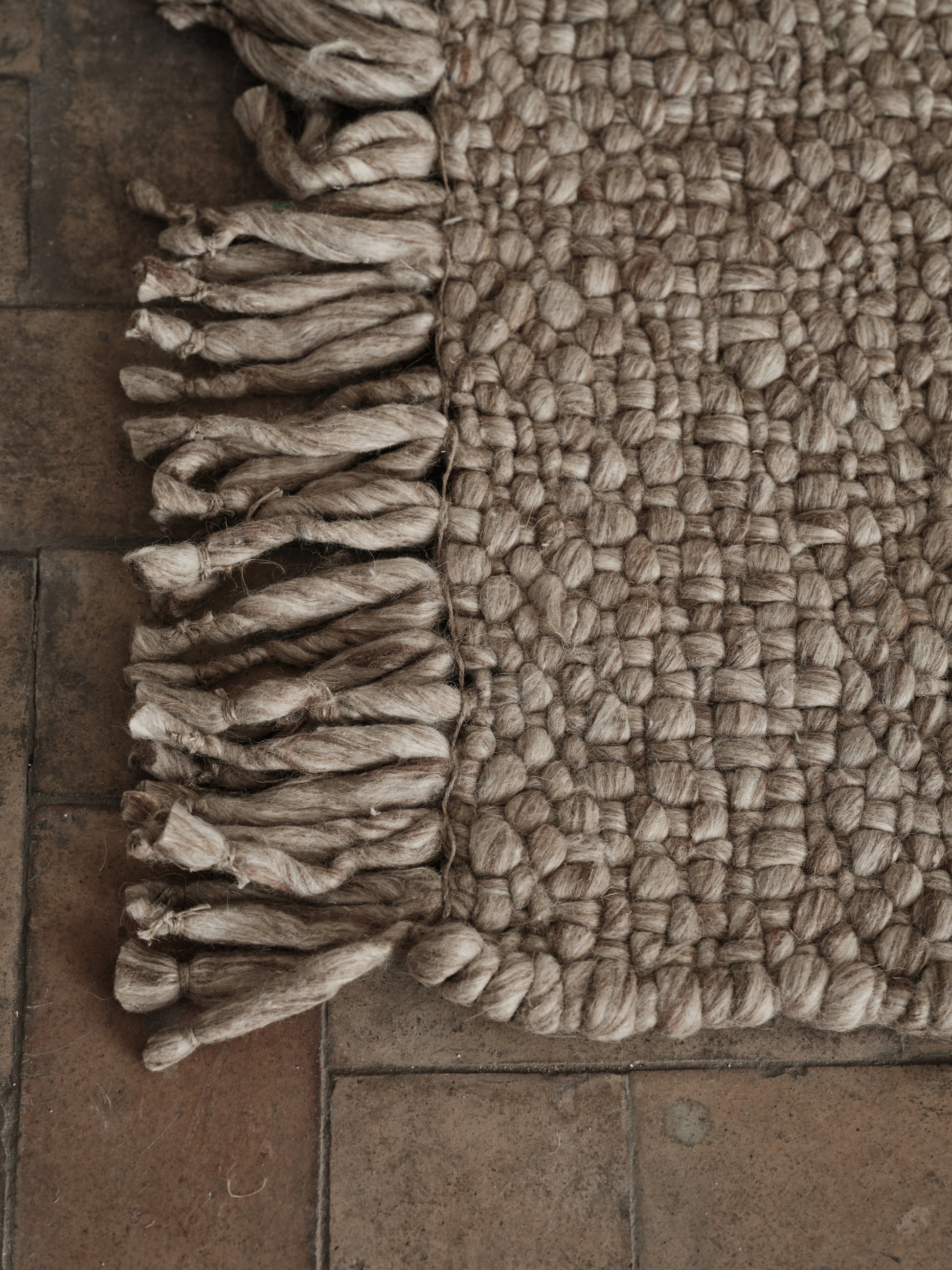 Compact and earthy, this rug is woven from thick, luxurious wool in a classic basket weave. Its oversized texture flows into voluminous side fringes, adding a rustic yet refined presence that anchors a room.
