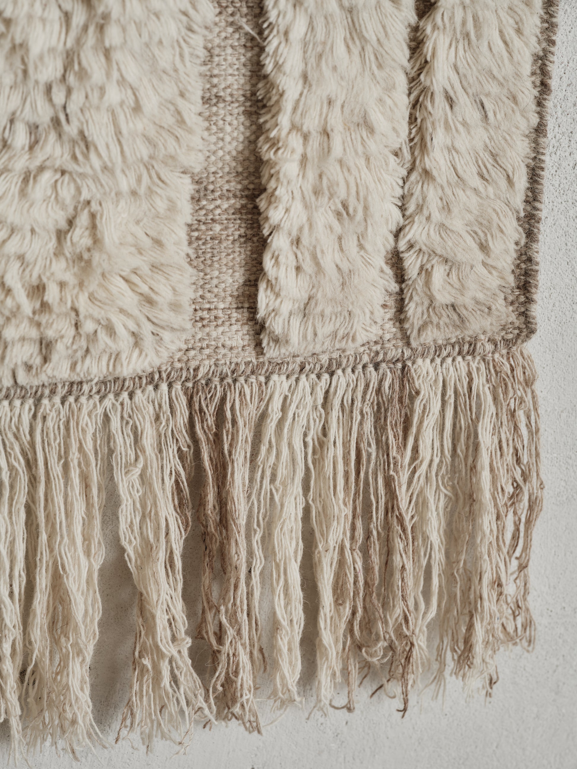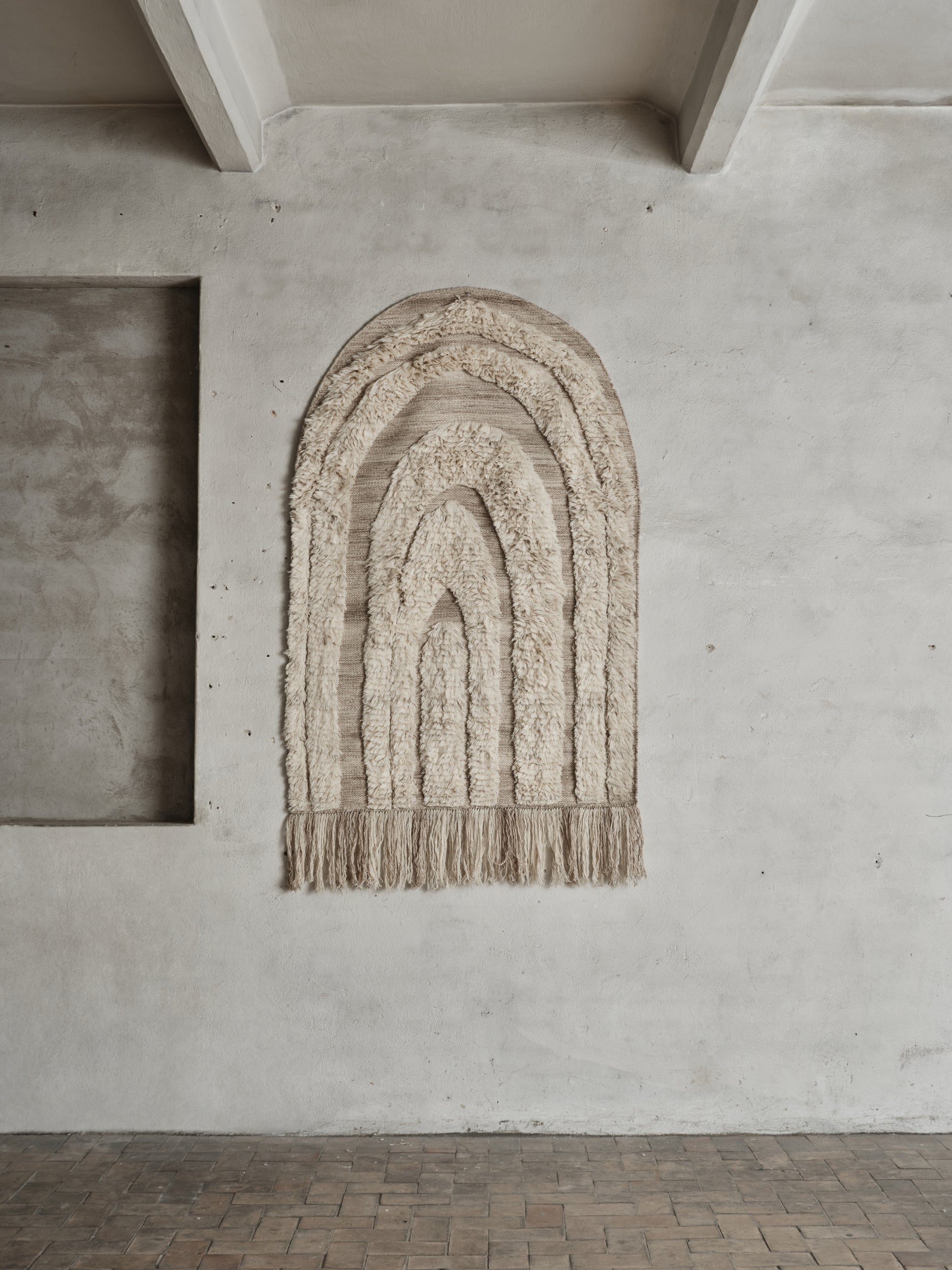 It is a true decorative statement piece, which can be hung on the wall or used as a classic floor rug. A sculptural piece with a bold character, this rug blurs the line between textile and art. Its sweeping arch-like motif and textural variation in pile height offer a poetic rhythm. Perfect for walls or floors, the hand-knotted fringe brings a refined, bohemian flair to its final edge.