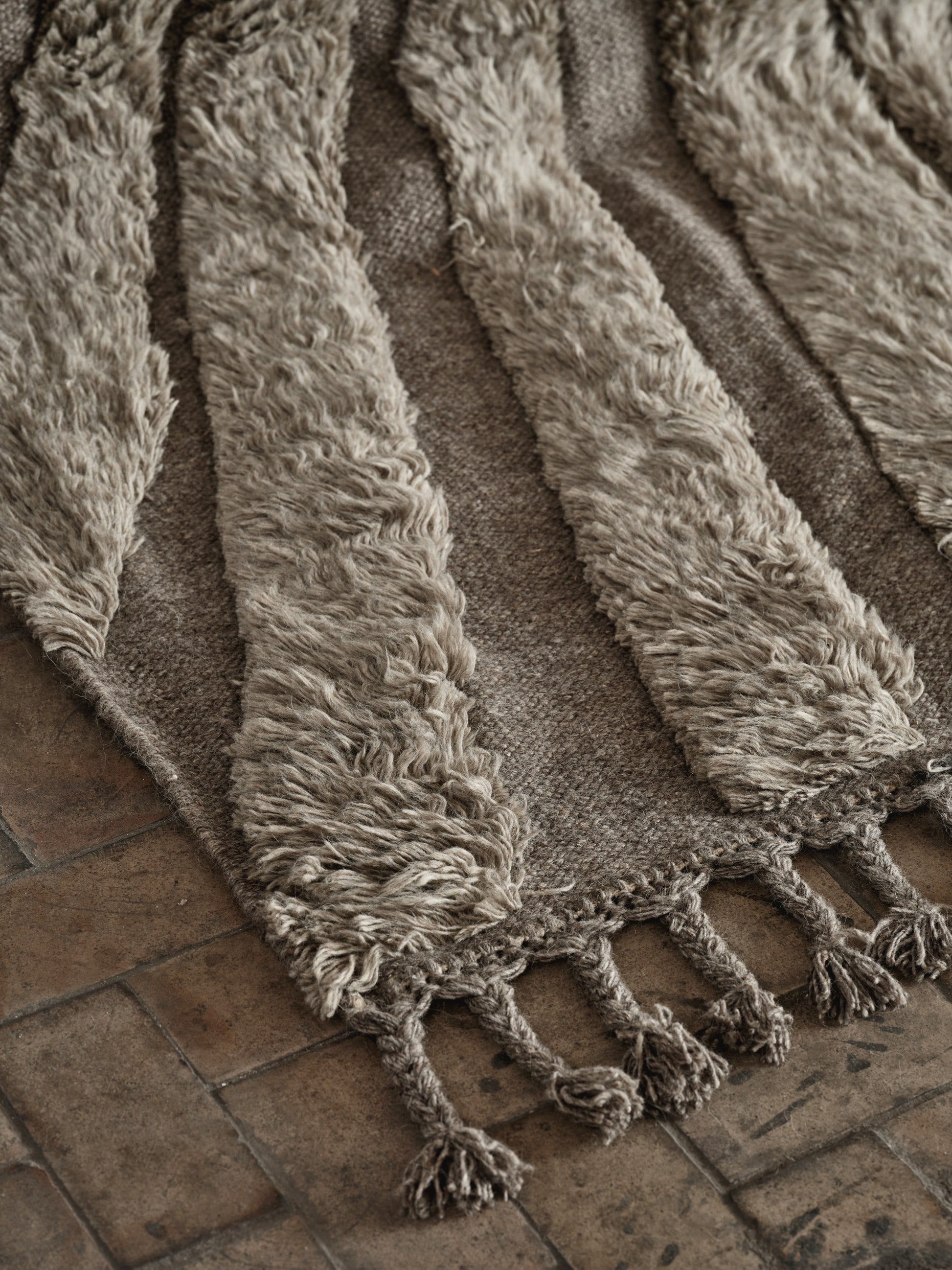 Subtle yet expressive, this rug is a study in texture and craftsmanship. The irregular hand-tufted pattern offers a sense of movement, while fringed ends add a quiet, ethnic character. Ideal for neutral spaces needing depth and softness.